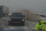 After a few seconds, the officer notices an SUV barreling at him and jumps out of the way before the vehicle falls off the road.